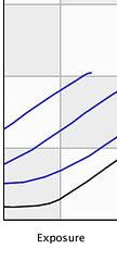 To the left is a few 6-stop segments of Tri-X (in blue) and T-Max 100 (in black). For all the noise people make about how print film has so much dynamic range, it turns out (and I didn't entirely realize this on my own -- Ron Mowrey had to point this out) that when you print and develop at "standard" contrast, you are actually only getting between 5 and 6 stops of dynamic range. Your highlights and shadows are, by default, blocking up. And that's OK, because if you blindly try to show the whole dynamic range, it'll look flat and uninteresting.